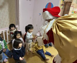 12月23日ファンキーモモにサンタさんがやってきました☆ちょっぴり涙の子、思わず笑顔になる子、それぞれの反応がとても可愛らしく笑顔いっぱいの賑やかなクリスマス会になりました♪